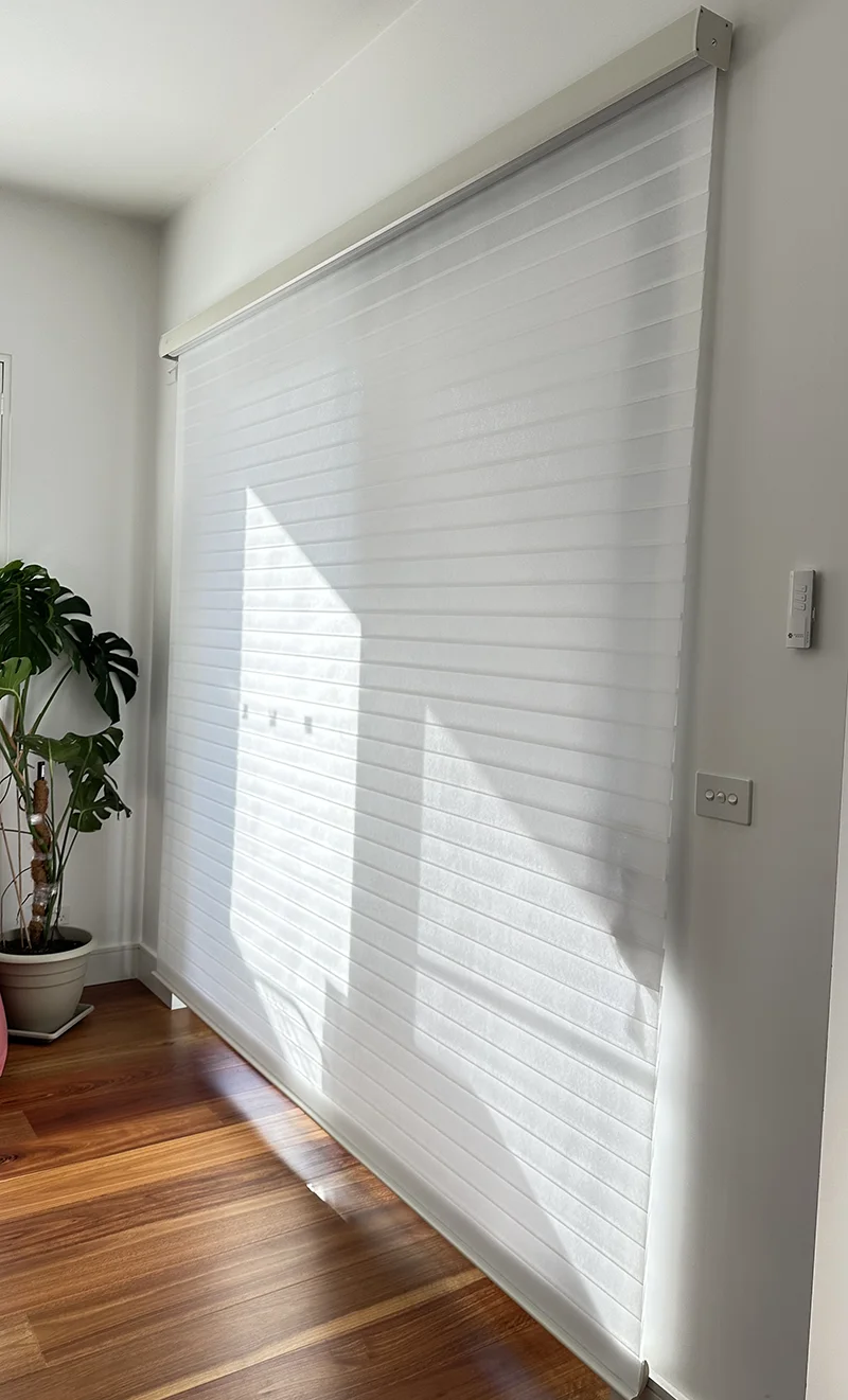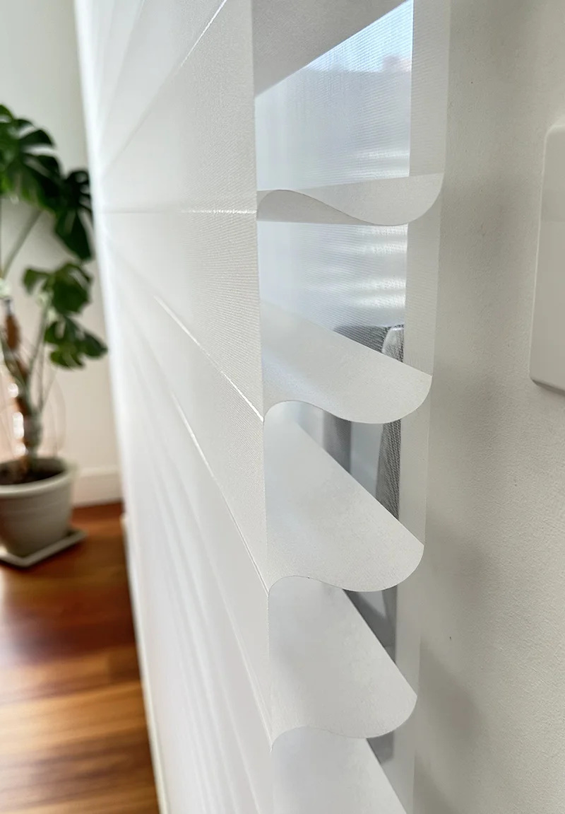 This is a curtain made of vertically hanging sheer fabric strips, combining the three-dimensional feel of traditional vertical blinds with the lightweight translucency of sheer curtains. It can both adjust light and maintain a sense of spatial openness. With three modes—fully open, semi-shaded, and closed—it's an excellent choice for transparency + flexible light control, especially suitable for living rooms, studies, and offices that seek a balance of natural light, privacy, and aesthetics. Available with either manual cord-pull or motorized remote control.