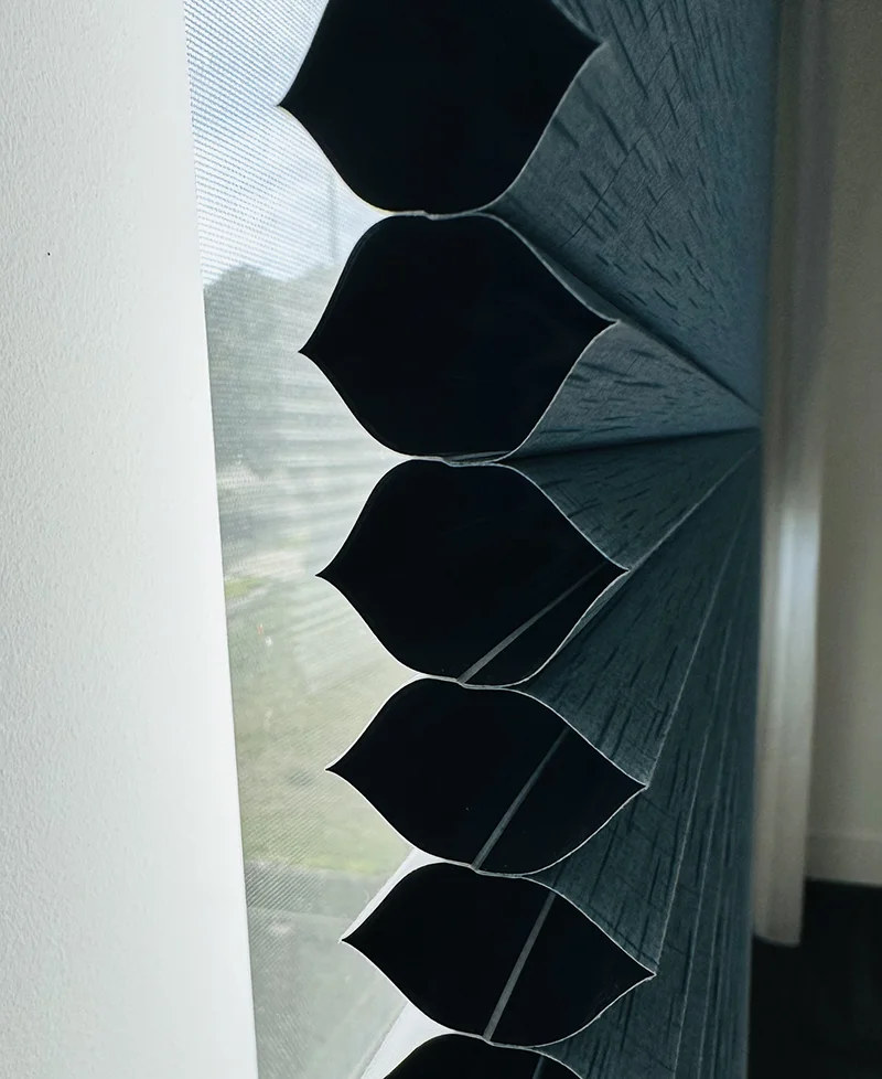Named for its unique honeycomb-like structure, this curtain design forms sealed air layers that effectively block heat and cold transfer, providing summer heat insulation and winter warmth retention with significant energy-saving effects! It also absorbs some sound waves, reducing outside noise interference. Available in full blackout, semi-blackout, and light-filtering versions, including dual-purpose day-and-night honeycomb curtains. Suitable for bedrooms, living rooms, studies, and especially ideal for skylights in sunrooms. While adjusting light and insulating heat, it maximizes outdoor views. Offers both manual cord-pull and motorized remote control options.